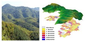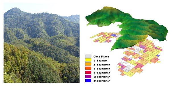 Wald-Biodiversitätsexperiment in China, Jianxi Provinz. Entlang eines Gradienten des Baumartenreichtums von Monokulturen bis 24-Artenmischungen werden durch die DFG-Forschungsgruppe „BEF China“ viele Ökosystemprozesse untersucht, um zu verstehen, wie diese von einem Verlust der Baumartenvielfalt beeinflusst werden. Foto: Christian Wirth, Karte: Helge Bruelheide.
