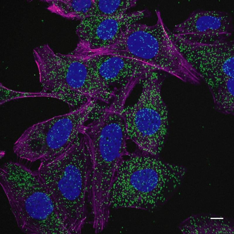 Die grünen Punkte in diesem Fluoreszenzbild zeigen die Bindung des Leukämie-assoziierten NPM1c Proteins an den Recycling-Regulator GABARAP