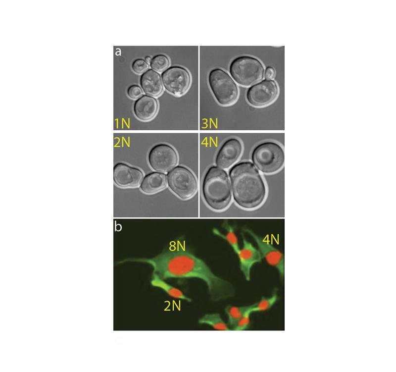 Eine erhöhte Ploidie ist in der Natur häufig anzutreffen und führt zu auffälligen Veränderungen von Zellgröße und Zellphysiologie: a) Knospende Hefen mit unterschiedlicher Ploidie; b) Menschliche Fibroblasten mit unterschiedlicher Ploidie. TUK, Galal Yahya, AG Storchova