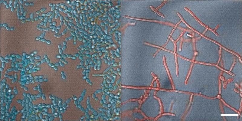 Candida albicans in seiner harmlosen (links) und seiner infektiösen (rechts) Form. Der weisse Balken entspricht 20 Mikrometern. Julie Takagi et al., Nat. Chem. Biol. 2022