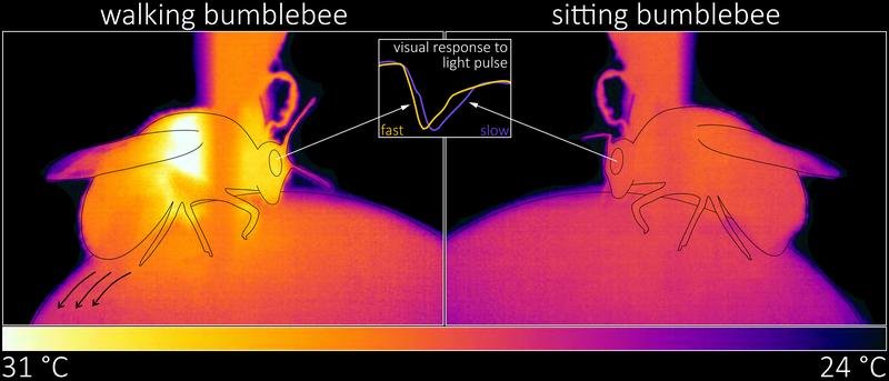 Möglichkeit zwei: Die Tiere wärmen sich aktiv auf, um visuelle Reize schneller zu verarbeiten. Das hätte schon allein deshalb Vorteile, weil sich die visuell wahrgenommene Umgebung in Bewegung schneller verändert. Diese schnelleren Bilder können die Hummeln also auch schneller verarbeiten. Im Flug steigt die Kopftemperatur der Hummeln auf ca. 35°C an. Dabei wäre die Verarbeitungszeit für Sehinformationen im Auge dann nur noch halb so groß wie im Sitzen – was passend zu der noch größeren Informationsflut im Flug wäre.