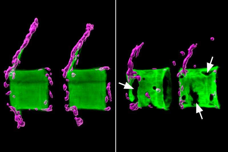 Links zwei gesunde Wirbelkörper aus der Wirbelsäule eines Medaka-Fisches: Die Knochenmatrix (grün) ist normal mineralisiert und von knochenbildenden Zellen (magenta) umgeben. Rechts die Situation bei einem osteoporotischen Fisch