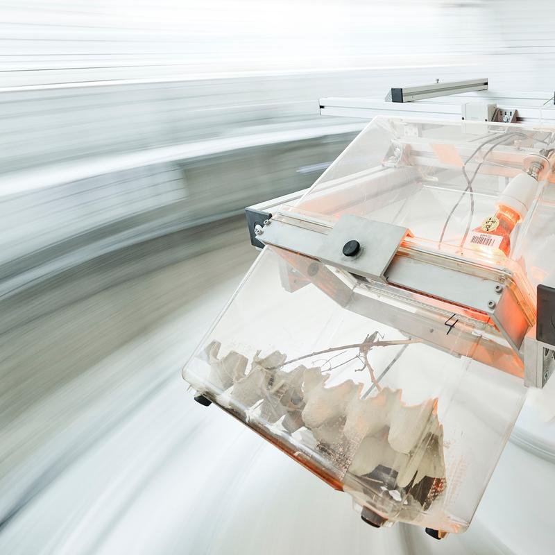 Um diese grundlegende biologische Frage zu beantworten, zogen Wissenschaftler:innen der Arbeitsgruppe „Biologische Strukturen und Bionik" der Hochschule Bremen Heuschrecken mehrere Wochen lang in einer großen Zentrifuge und mit kleinen, eigens angefertigten „Rucksäcken" auf. Anschließend maßen die Forscher:innen die Steifheit der Beine und analysierten mittels Röntgenmikrotomographie die Struktur der Kutikula.
