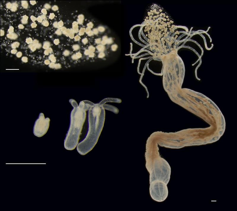 Verschiedene Lebensstadien der Seeanemone Nematostella vectenis. Oben links die Eier, Mitte links verschiedene Wachstumsstadien, rechts das erwachsene Tier