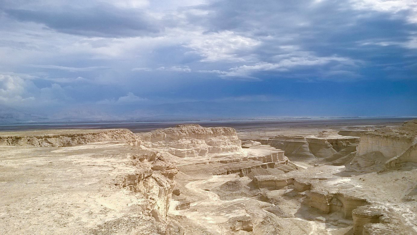 Die Sedimente bildeten sich im Lisan-See während des Hochstands des Sees vor ca. 24.000 bis 14.000 Jahren. Heute befinden sich diese lakustrischen Ablagerungen mehr als 200 Meter über dem Wasserspiegel des Toten Meeres. Blick von Masada über das Tote Meer. (Foto: GFZ)